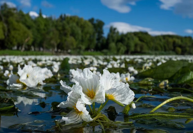 在云南大理洱海,海菜花正連片綻放,微風搖蕩,薄薄的白色花瓣如同水晶般晶瑩剔透,與鵝黃的花蕊一同一顫一顫兒地搖曳起來,遠遠望去,似雪非雪卻勝雪。