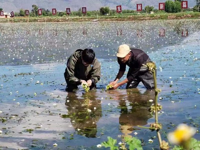 因此,在9年前,洱海治理團隊就“看上”了海菜花,他們用幾年的時間研究,將海菜花從湖里邊撈起來,像插水稻一樣種在農田里,喜獲成功,經過七八年努力,種植面積達到了幾千畝。但它的前提條件是——水必須是清澈的好水。