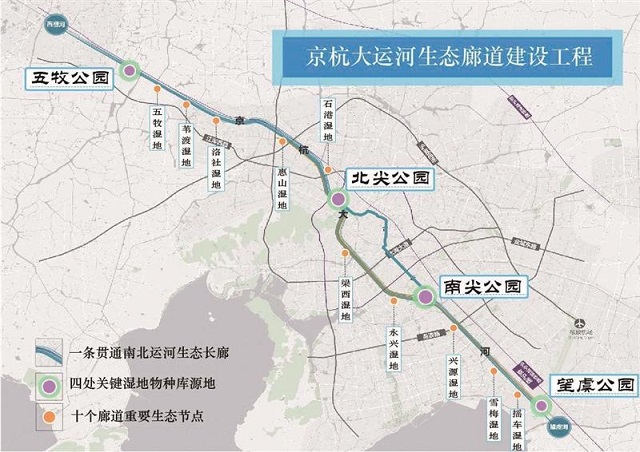 岸線全面覆綠、生態(tài)通道提質(zhì)、水岸空間重構(gòu)……明年底,通過生態(tài)廊道工程的建設(shè),一條貫通南北運(yùn)河的生態(tài)長(zhǎng)廊將展現(xiàn)在世人面前。利用大運(yùn)河的聯(lián)通性,這條綠帶上將構(gòu)建起“一廊、四源、十節(jié)點(diǎn)”的空間布局。4個(gè)“物種庫(kù)”源地分別為五牧公園、北尖公園、南尖公園、望虞公園,它們是濕地鳥類的天堂、濕地魚類的樂園,能展現(xiàn)濕地凈化的魅力,又集運(yùn)河植物的大觀。從五牧濕地到搖車濕地,由北向南如珍珠般鑲嵌其中的10個(gè)重要生態(tài)節(jié)點(diǎn),將成為運(yùn)河水生生物的暫棲地,為這道絕美風(fēng)景錦上添花。
