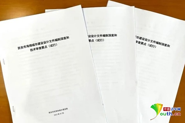 由陜西西咸海綿城市工程技術有限公司(灃西新城海綿城市技術中心)聯合中聯西北工程設計研究院有限公司等有關單位編制的《西安市海綿城市建設設計文件編制深度和技術審查要點(試行)》文件。灃西新城供圖