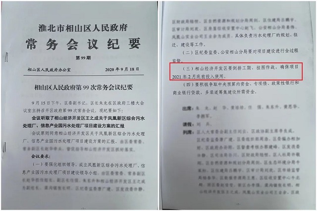 偏偏相山區(qū)一點(diǎn)也不急,嘴上喊著已經(jīng)在走流程了,其實(shí)是2020年9月才研究部署食品工業(yè)園污水處理廠建設(shè)工作,并且相關(guān)工作僅停留在文件上,直至本次督察進(jìn)駐前夕,相山區(qū)才再次啟動(dòng)污水處理廠的建設(shè)工作,目前尚處于項(xiàng)目土地報(bào)批階段。