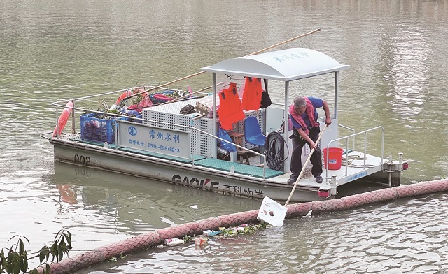 在老大運(yùn)河中吳大橋段,兩座長(zhǎng)達(dá)20多米的漂浮物攔截設(shè)施橫貫水面,如同一張過(guò)濾網(wǎng),攔截上游漂浮來(lái)的垃圾,等待河道保潔員清理。“一天最起碼能收集到五六船垃圾,有七八百斤。有了這個(gè)攔截設(shè)施,河面上的垃圾基本不會(huì)往下游去了。”市河道湖泊管理處河道保潔隊(duì)隊(duì)長(zhǎng)蔣建國(guó)介紹。