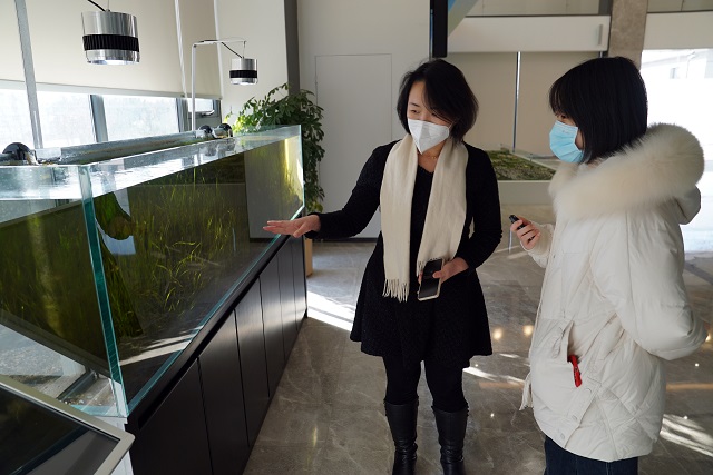 牛奕娜在魚缸前為記者介紹魚的情況。