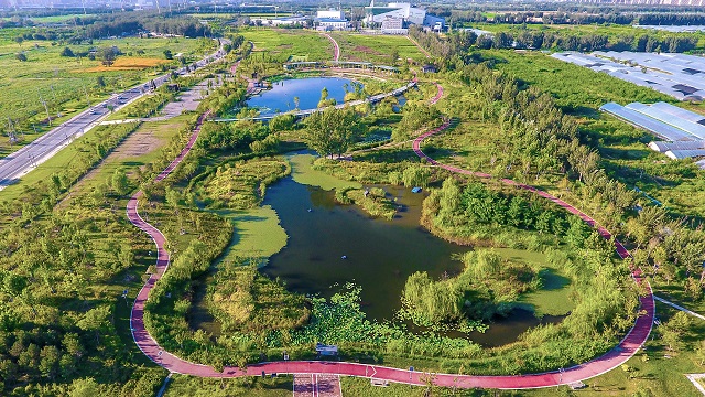 “我們通過利用植物與水系形成山水環境,把生態功能濕地、文化景觀元素、田園郊野風貌、濕地水系景觀進行有機融合,在大尺度上形成由北向南山林環繞,水系流動的空間格局?!迸^饶冉榻B,“通過水生植物的吸收、濕地填料的吸附、微生物的分解等方式能夠削減面源污染,穩定河道水質和保護河道水生態系統的健康?!?br />