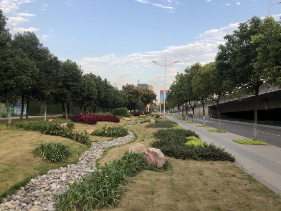 城市道路兩側(cè)的綠地也是改造的重點(diǎn)區(qū)域之一。在德陽(yáng)市青衣江路,除了新增設(shè)的雨水花園外,道路兩側(cè)的綠地都比過去變“矮”了一些。