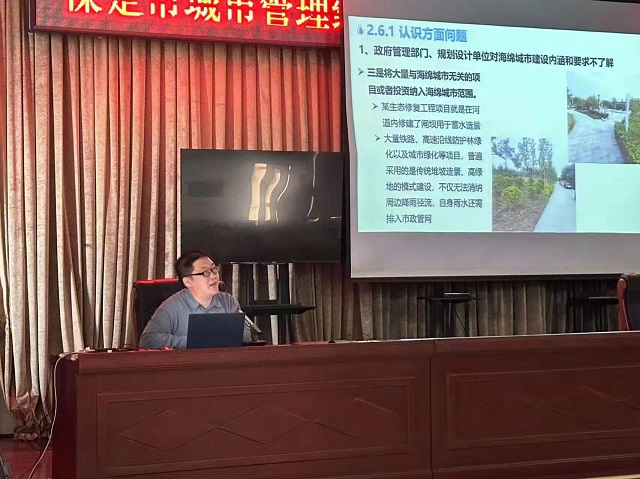 接著,馬洪濤教授針對規(guī)劃是基礎(chǔ),構(gòu)建全面科學(xué)的海綿城市規(guī)劃體系;方案是指引,編制合理系統(tǒng)的海綿城市實施方案;項目是根本,做好科學(xué)合理的海綿城市設(shè)計方案;機制是基礎(chǔ),構(gòu)建完整可行的海綿城市推進機制;模式是保障,選擇綜合統(tǒng)籌的海綿城市建設(shè)模式;交流是助力,形成通俗易懂的海綿城市語言體系等方面,結(jié)合其他城市建設(shè)經(jīng)驗,針對保定實際,做了深入淺出、通俗易懂的細致講解。