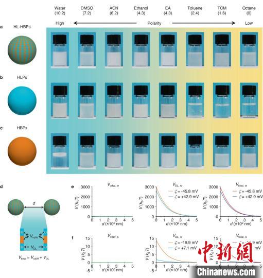 王樹濤指出,研究團隊在之前基礎(chǔ)上進一步研究發(fā)現(xiàn),親水-疏水異質(zhì)微球表面具有交替的親水、疏水成分,這種結(jié)構(gòu)既有利于高極性溶劑(水)的鋪展,又有利于中等極性溶劑(乙醇等有機溶劑)、低極性溶劑(辛烷等油性有機溶劑)的鋪展。此外,在親水區(qū),很容易引入帶電基團,這些基團能為顆粒間提供靜電排斥作用,從而在不同溶劑中實現(xiàn)良好的分散。