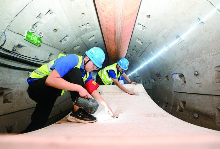 近日,天津市濱海新區(qū)雨污分流改造工程項目雨水主管隧道順利貫通,為項目完工打下堅實基礎(chǔ)。據(jù)介紹,項目建成后,區(qū)域內(nèi)雨水和污水將“各行其道”,有利于提升市政道路排水能力,暢通城市排水管網(wǎng),緩解汛期城市內(nèi)澇問題。圖為工作人員在雨水主管隧道內(nèi)檢查盾構(gòu)管片。