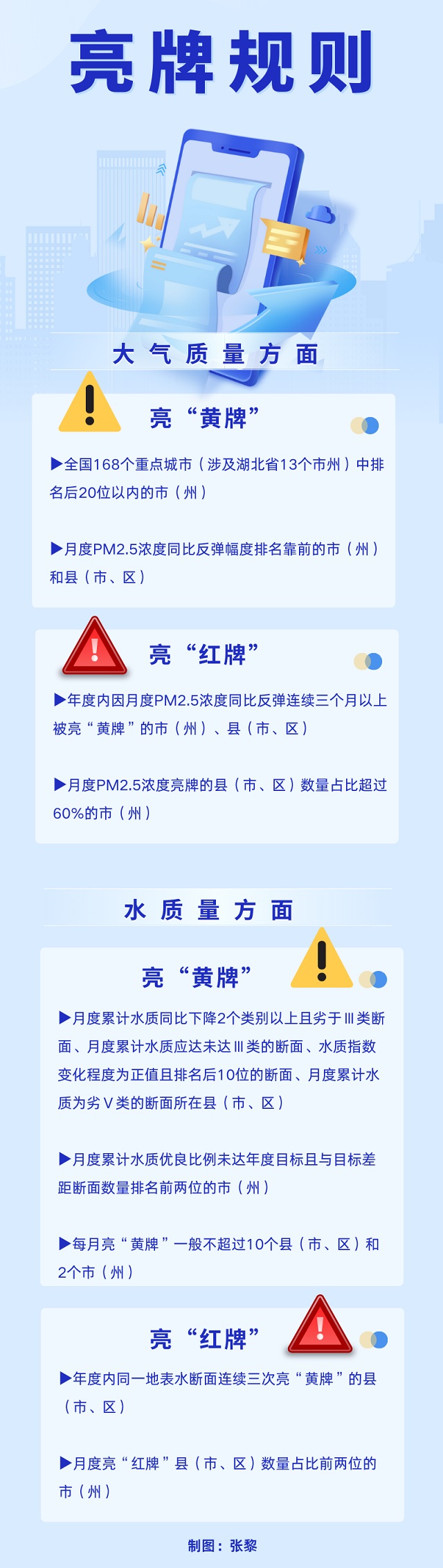 具體而言,大氣質(zhì)量方面,對全國168個重點(diǎn)城市(涉及湖北省13個市州)中排名后20位以內(nèi)的市(州)亮“黃牌”;年度內(nèi)因月度PM2.5濃度同比反彈連續(xù)3個月以上被亮“黃牌”的市(州)、縣(市、區(qū)),將亮“紅牌”。