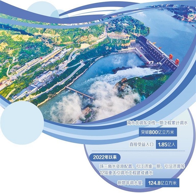 水利部規劃計劃司司長張祥偉介紹,目前,南水北調東中線一期工程累計調水突破800億立方米,直接受益人口達1.85億人。2022年以來,珠三角水資源配置、引江濟淮一期、引漢濟渭等12項重大引調水工程建成通水,新增年調水量124.8億立方米;西江大藤峽、新疆大石門等24座大型水庫建成投用;新開工的黃河古賢水利樞紐等31項流域防洪控制性工程和重點水源工程建成后可新增供水能力49億立方米。