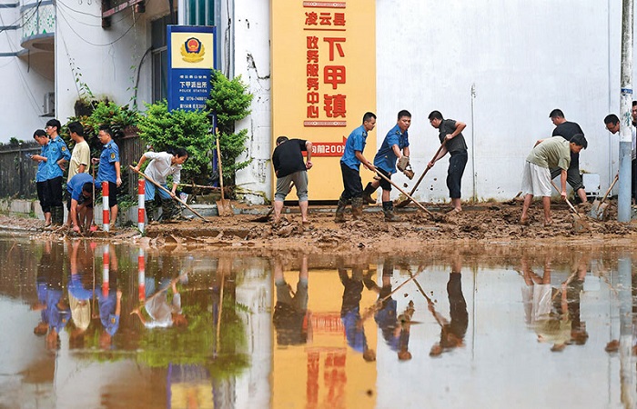 在廣西百色市凌云縣下甲鎮(zhèn),人們在清理道路上的淤泥(2023年8月24日攝)陸波岸攝/本刊